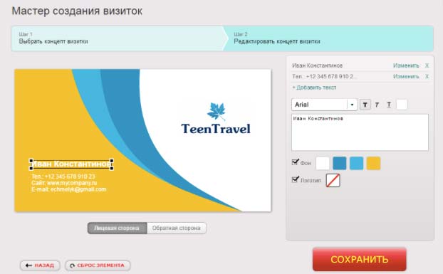 Дополнительным преимуществом является то, что прямо тут же можно создать один или несколько концептов визиток, фирменных бланков, конвертов. Редактирование осуществляется также как в случае с логотипом. Можно прямо на сайте, можно после скачивания в графических редакторах.