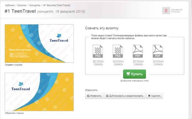 Скачивание визитки не отличается от скачивания логотипа. Выбираем формат и покупаем нужную визитку в нужном формате