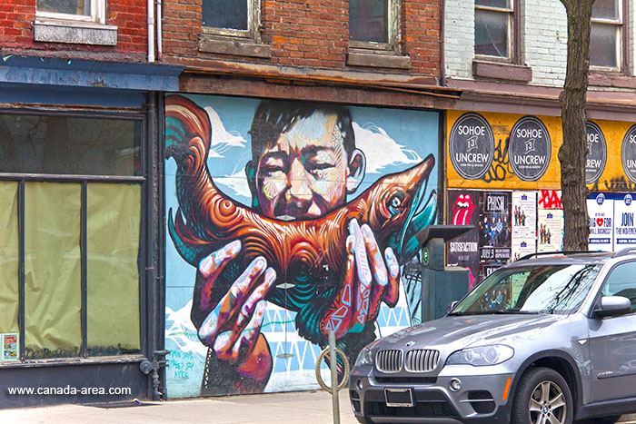 Queen Street одна из центральных улиц Торонто. Если прогуляться в западную часть города по этой улице, то там большое количество красивых небольших домов, огромное количество граффити и просто неплохой район для прогулок.