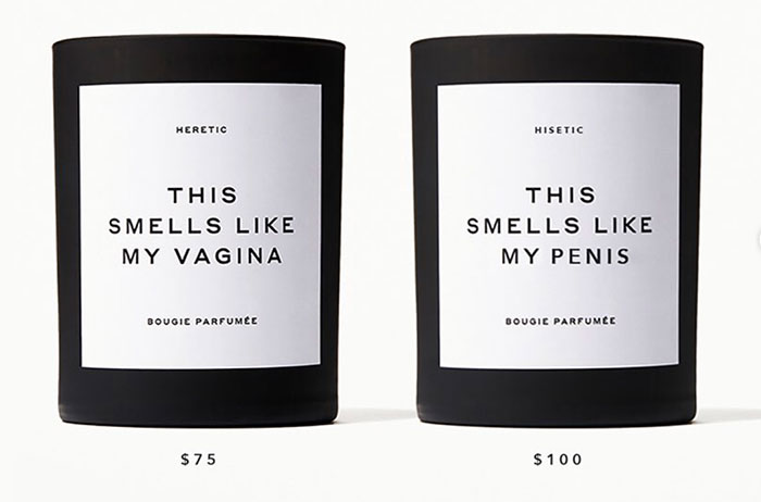 Целью данной компании является не продажа продукта и не заработок денег, а лишний раз подчеркнуть проблему неравной оплаты труда. Просто свечи с запахом гениталий мужчины стоят 100 долларов, а с запахом женщины 75 долларов.