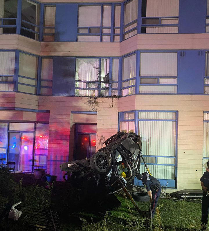В Mississauga (Онтарио) машина врезалась в окно здания на втором этаже.