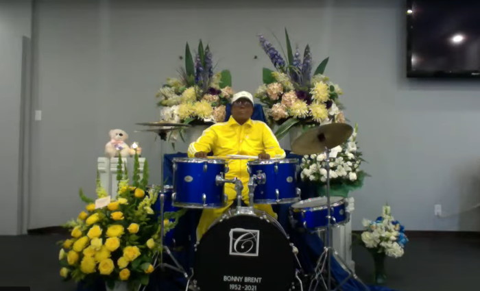 На похоронах в Торонто ушедшего из жизни музыканта поместили среди цветов за барабанную установку.