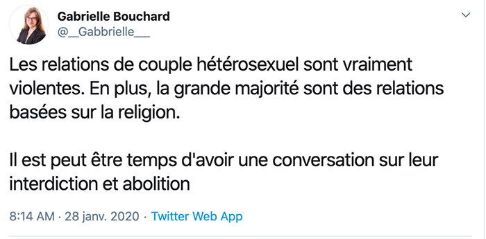 Президент канадской федерации женщин Габриель Бушар Квебека в своем Твитере написала о том, что нужно запретить отношения между мужчинами и женщинами.