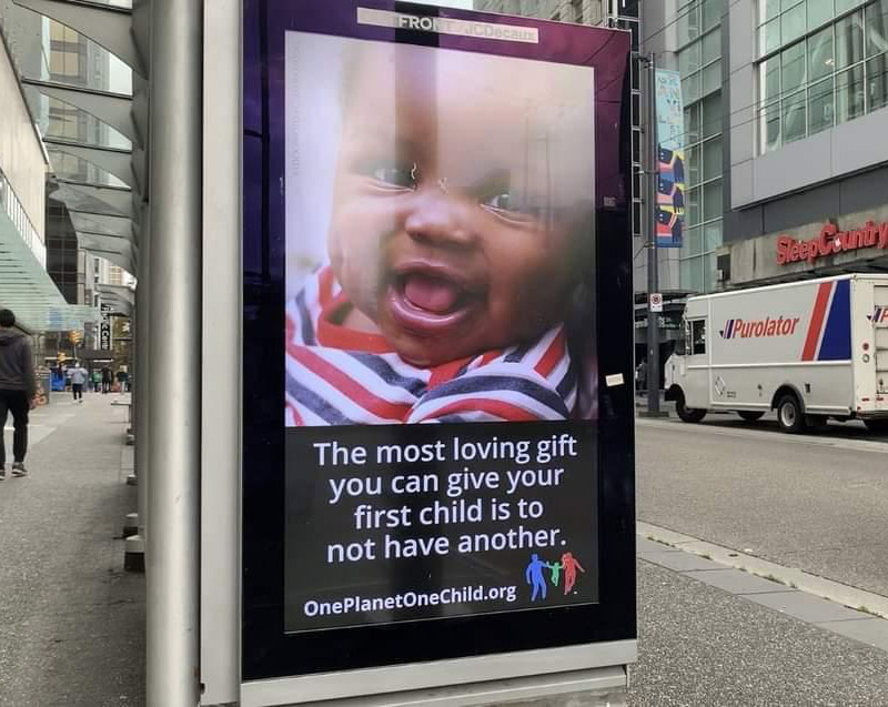 В Организации Одна Планета Один Ребенок считают, что на планете слишком много людей и решение есть – рожать только одного ребенка. В сети появляются фотографии плакатов, которые появились на улице в Канаде, на которых написаны лозунге:
