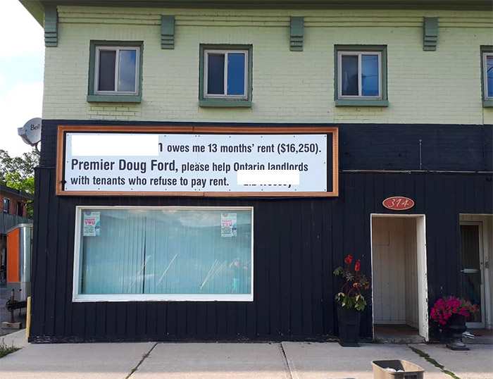 Арендодатель вывесил на здании знак, на котором написано обвинение в адрес арендатора, что тот не платит уже 13 месяцев. Неоднозначное действие, которое кто-то поддерживает, а кто-то порицает.
