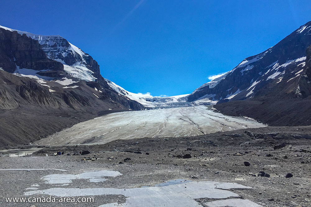 В провинции Альберта ледник Athabasca сохраняется даже летом. Когда в Калгари и Эдмонтоне уже июльская жара, среди гор продолжает лежать ледяной остров, который притягивает к себе туристов.