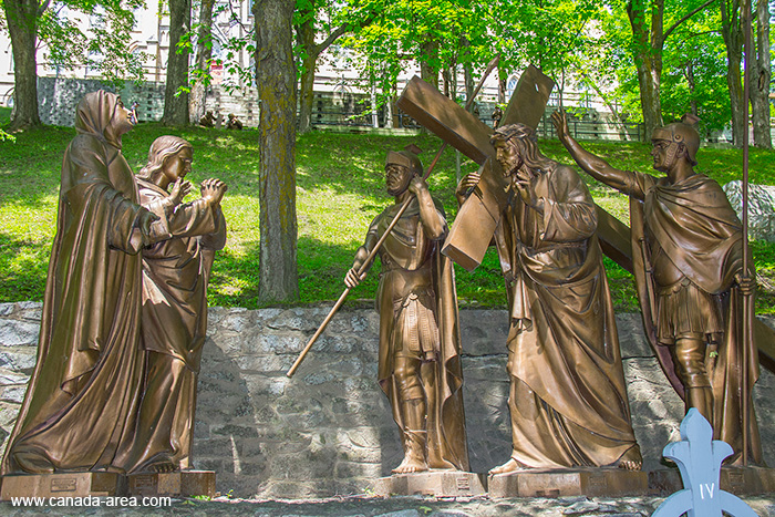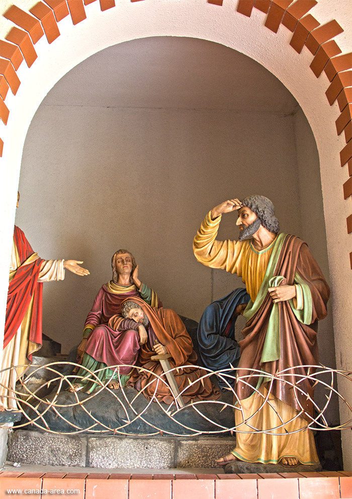 На территории церкви расположена дорожка в гору вдоль которой расположены скульптуры, изображающие день распятия Христа. Пока вы поднимаетесь по дороге, вы можете наблюдать в скульптурах как Христос шел на распятья, падал по дороге, как ему давала платок святая Вероника и как произошло распятие. Очень красивые фигуры.
